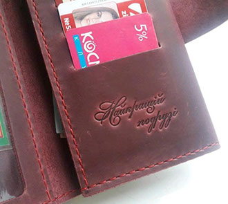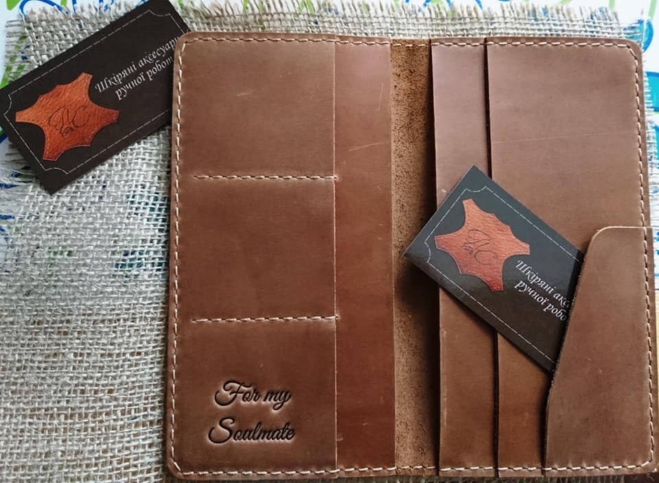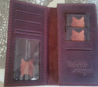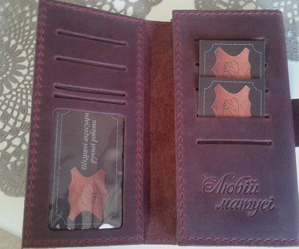 "Щиро дякую Сергію за якісні речі. Брала на подарунки обкладинку на паспорт, гаманець "Класік і "Гармашку", чоловіче портмоне. Всі замовлення були зроблені оперативно, з врахуванням моїх побажань та доставлені в обумовлені строки. Якістю задоволена, рекомендую."