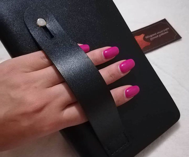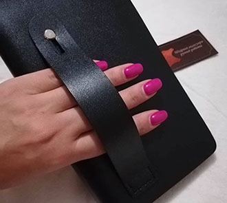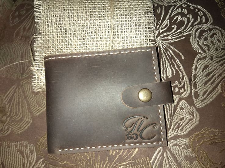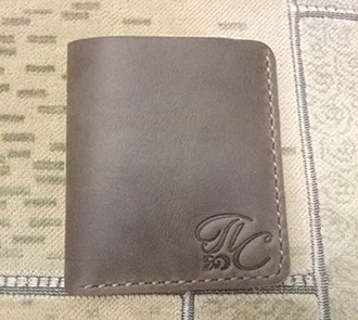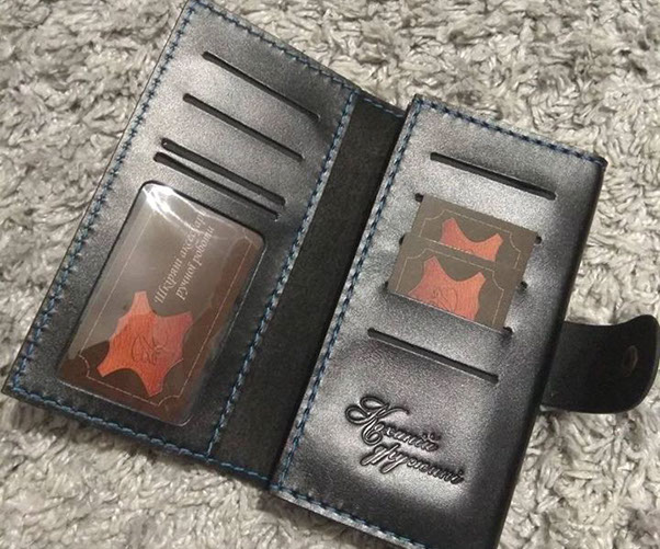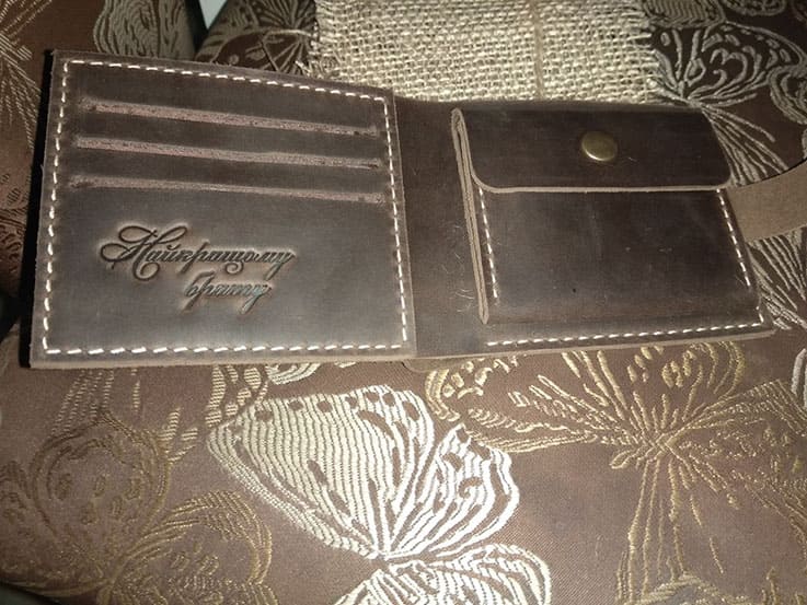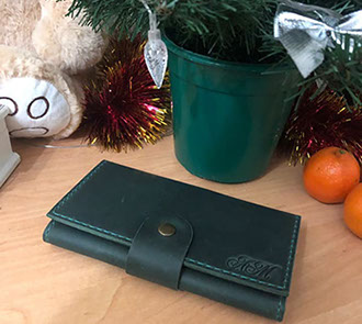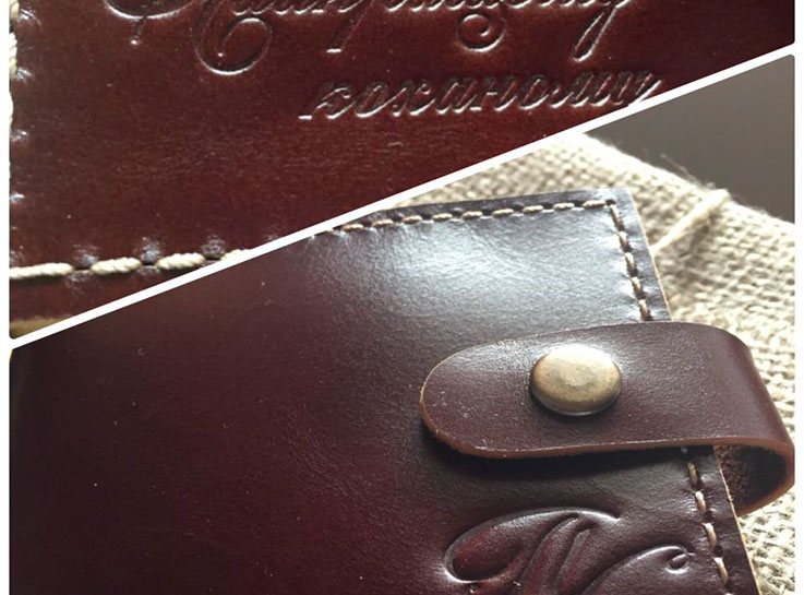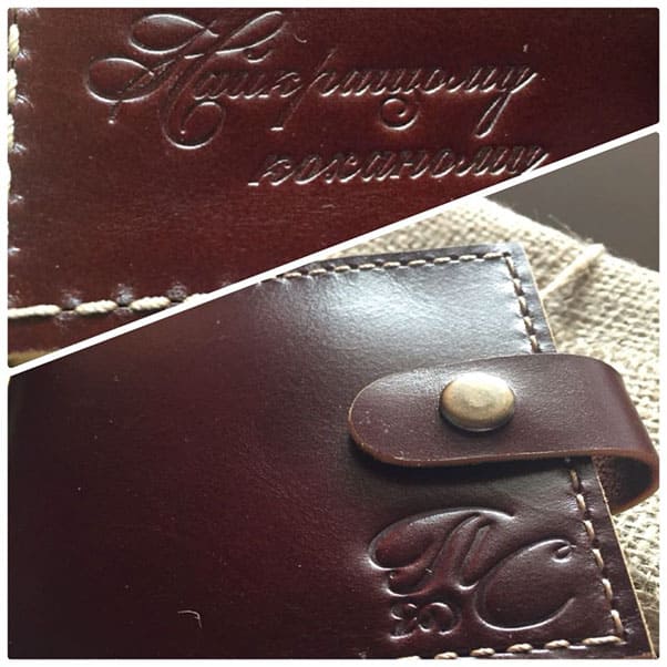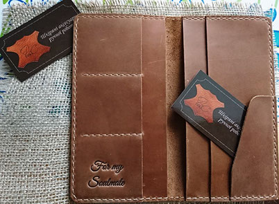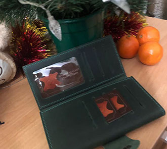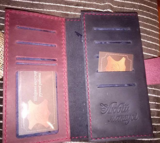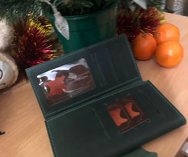 "Замовляла портмоне # 2 чоловіку на подарунок під ялиночку. Сергій виконав замовлення дуже оперативно, не дивлячись на велике навантаження у зв'язку з наближенням Нового року. Якість виробу на найвищому рівні, який тільки може бути. Портмоне виглядає чудово і дуже стильно. Нам надзвичайно сподобалося і впевнена, що звернемося ще не один раз. Дякуємо вам, з наступаючим святом, бажаємо натхнення і вдячних клієнтів!"