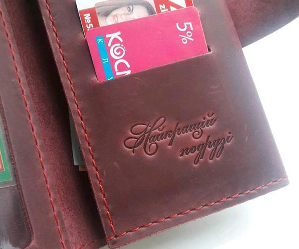 "Замовляв гаманець "Мій" на подарунок дівчині. Їй дуже сподобався. Гарна якість, швидка доставка, особливо сподобалось гравірування, що підкреслює його особливість. Дякую за Вашу працю!"